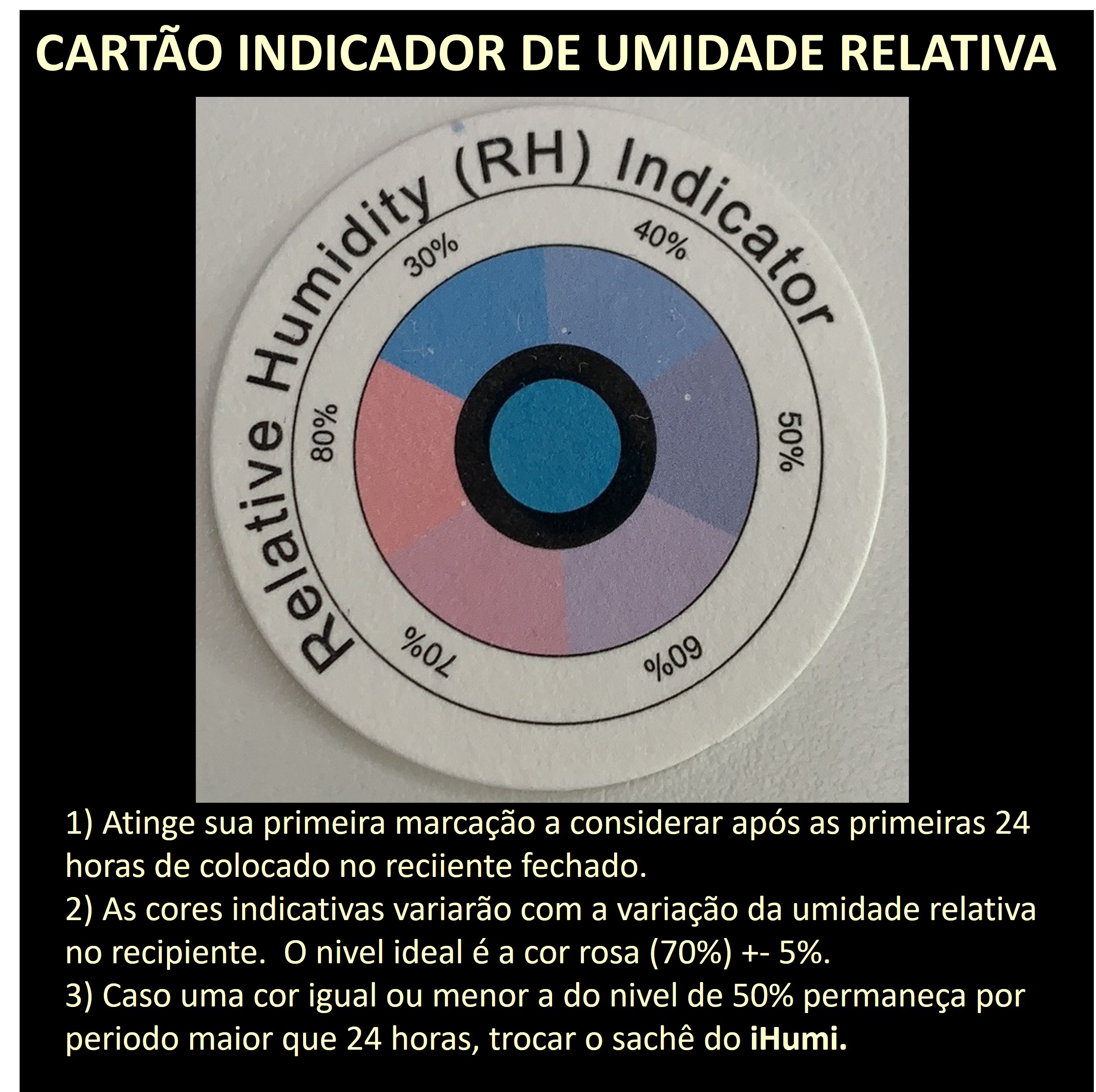3) Quando o cartão indicador de umidade relativa se fixar em uma umidade abaixo da desejada, é o momento de fazer a troca da unidade de seu iHumi. Em média a cada tres meses ou mais.