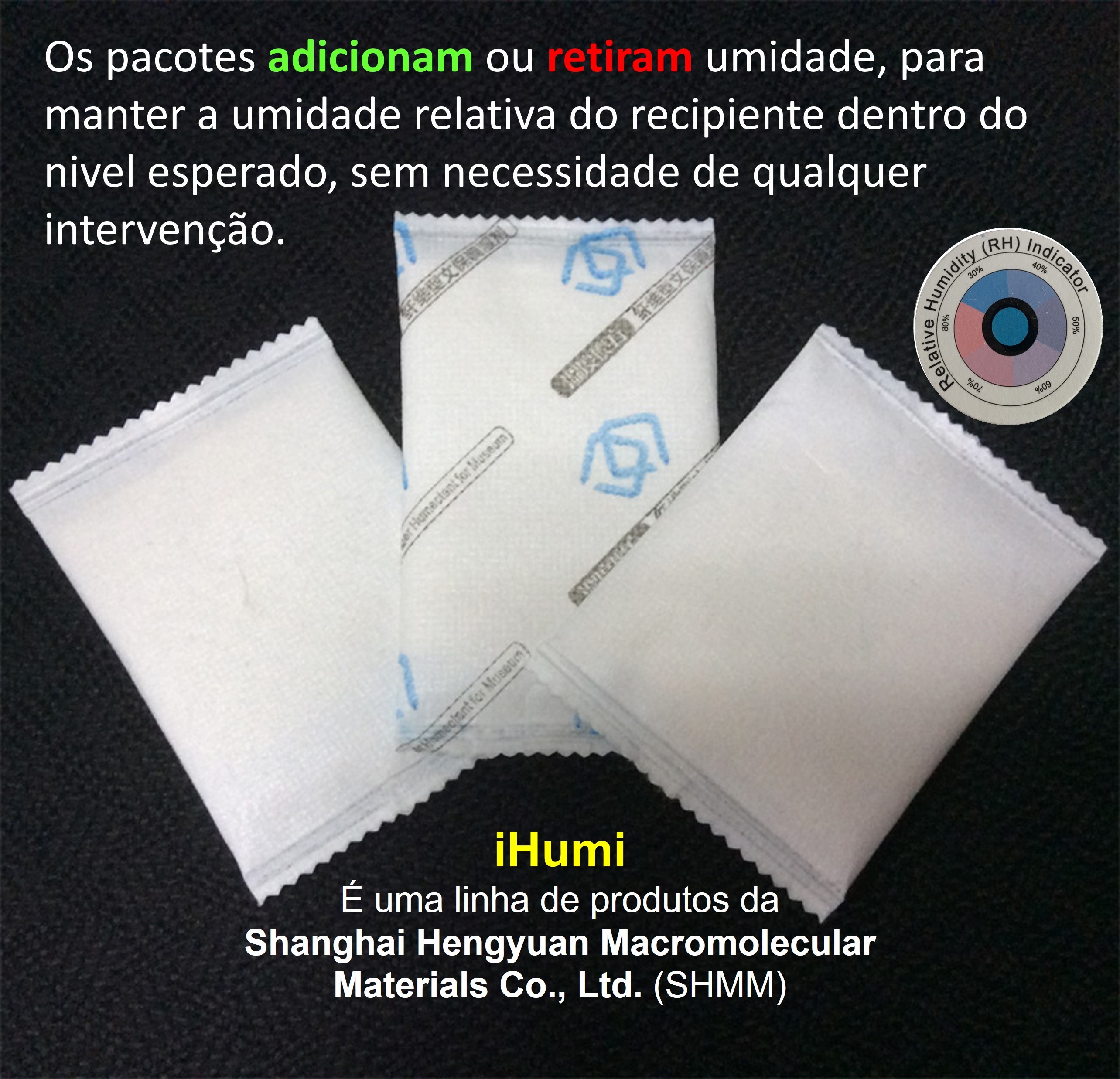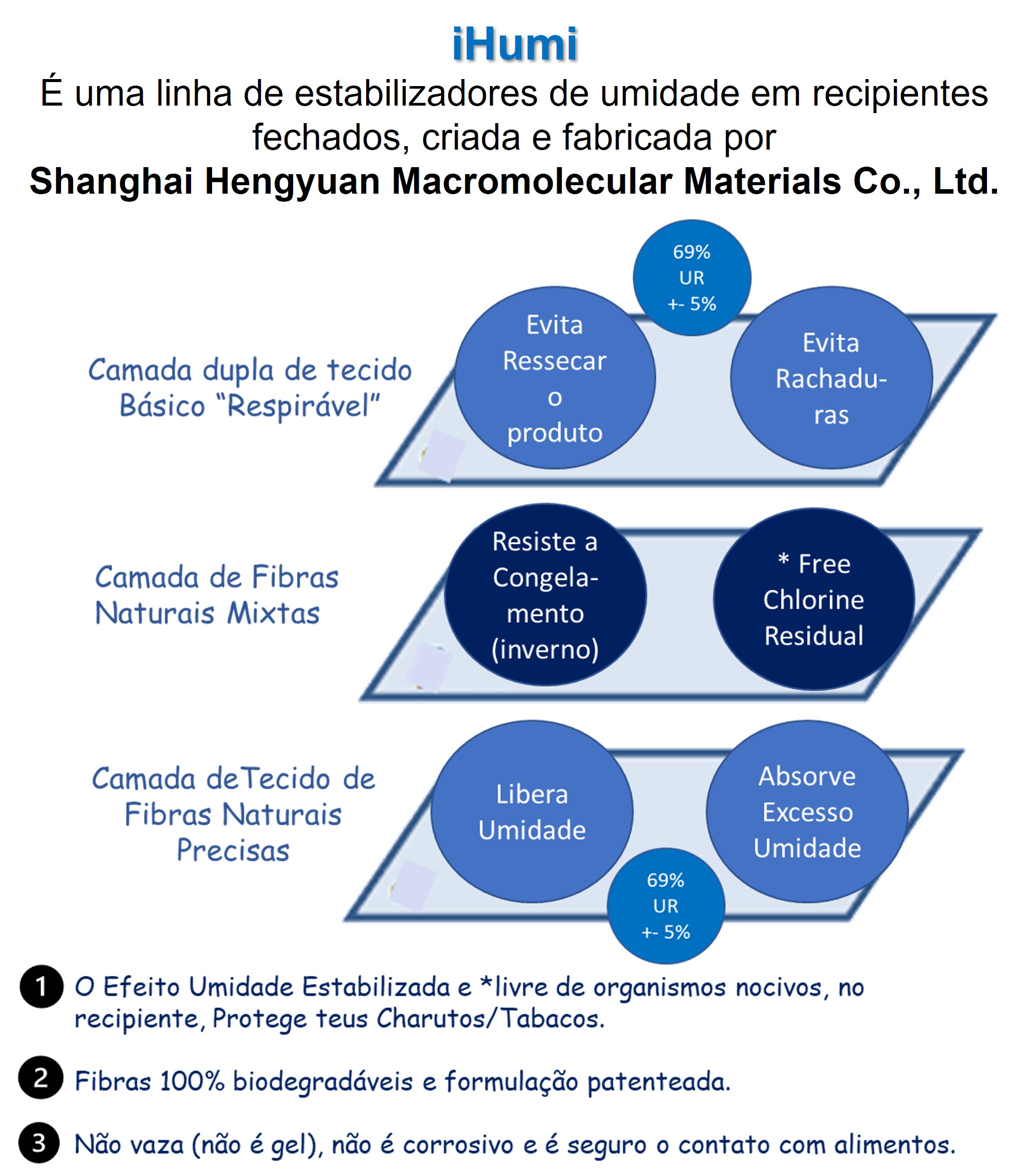 iHumi é uma linha de estabilizadores de umidade, para recipientes fechados, inventada, patenteada e fabricada por Shanghai Hengyuan Macromolecular Materials Co., Ltd. A qual detém várias patentes e trademarks, estando neste mercado a mais de 10 anos, servindo a vários segmentos, como grãos/sementes, remédios, equipamentos, tabaco e vários outros. Os produtos estão entre os mais seguros e eficientes do mercado (veja comparações). São feitos de fibras 100% biodegradáveis e é seguro até para estar em contato com alimentos e tabacos/charutos. Ele recebe um tratamento muito parecido com o tratamento de purificação da água em água potável e isso (free chlorine residual) faz com que a umidade que ele venha a liberar esteja livre de organismos nocivos a saude. Você pode ficar tranquilo pois ele não vaza, pois não contém gel e nem líquidos.