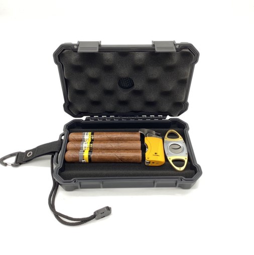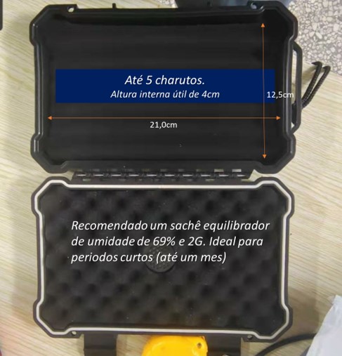 Porta-charutos de plástico duro. Material resistente a agua, poeira e impactos. Mini humidor portátil, com higrometro de mostrador externo.